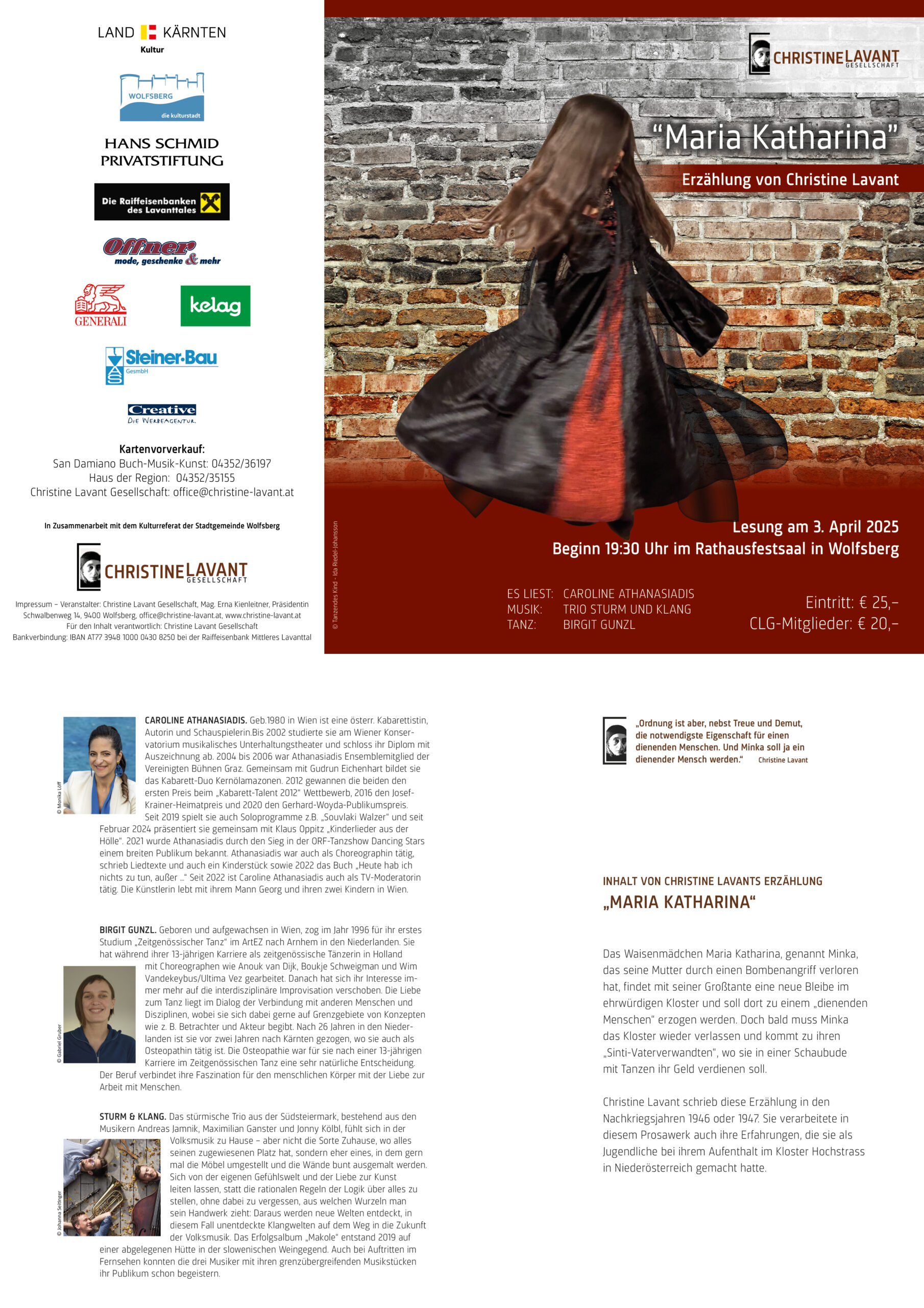 Lesung mit Caroline Athanasiadis, Musik: Trio „Sturm und Klang” aus der Südsteiermark mit tänzerischen Impressionen von Birgit Gunzl.